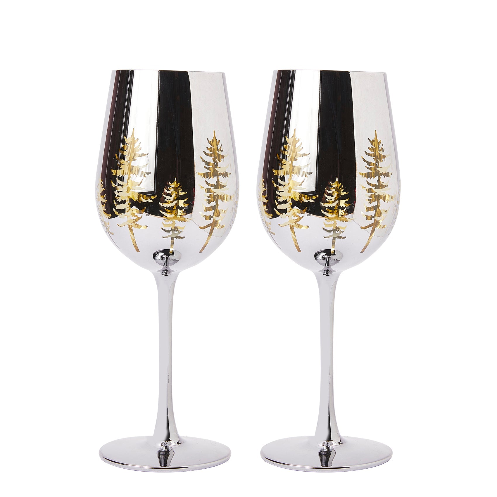 - Ring in the Holiday Season with this unique Christmas Wine Glass Set of 2 by Gute! Featuring two gold wine glasses with a beautiful winter wonderland design, it's the perfect drinkware to celebrate the happiest time of the year! Perfect for anyone who loves the holiday season or winter!