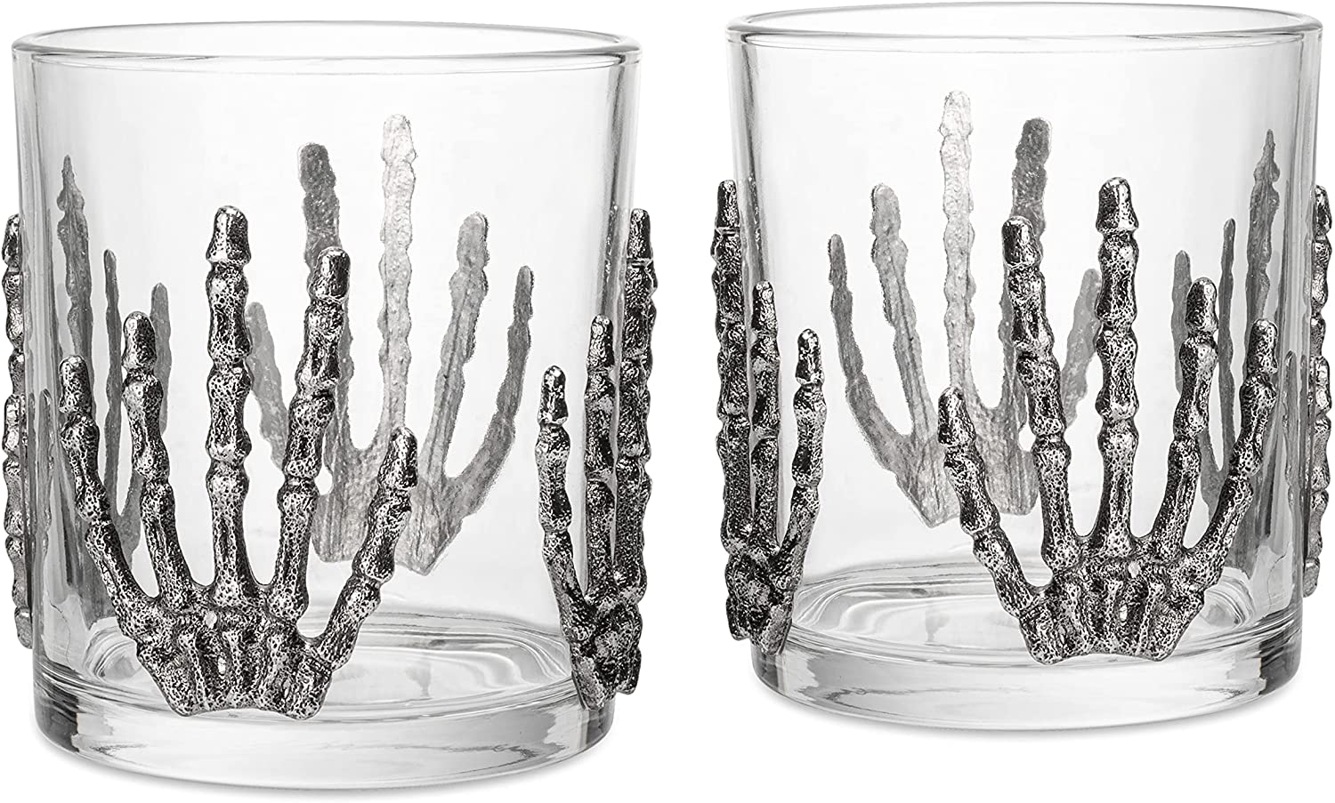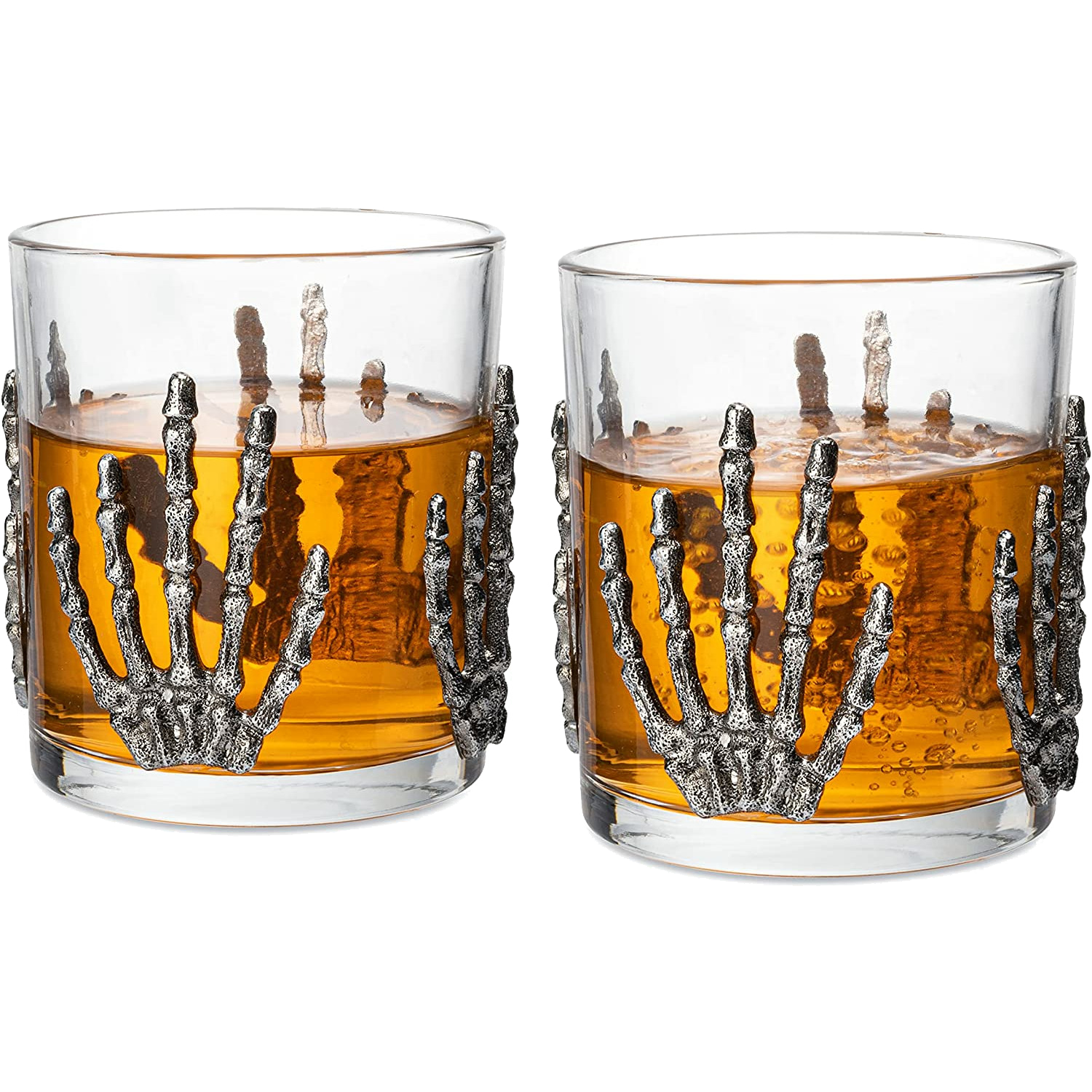 - Terrify and delight your guests when you dress up your next party with the Set of 2 Skeleton Hand Whiskey Glasses that each hold 10 oz of your favorite poison. Your whiskey will be even more delicious in these spooky glasses. Four skeleton handsare depicted in an elegant form adorning the glass that holds your favorite whiskey in a silver finish. These glasses are designed to spook your guests, your visitors and yourself when you look at them. An eerie and elegant addition to any occasion.