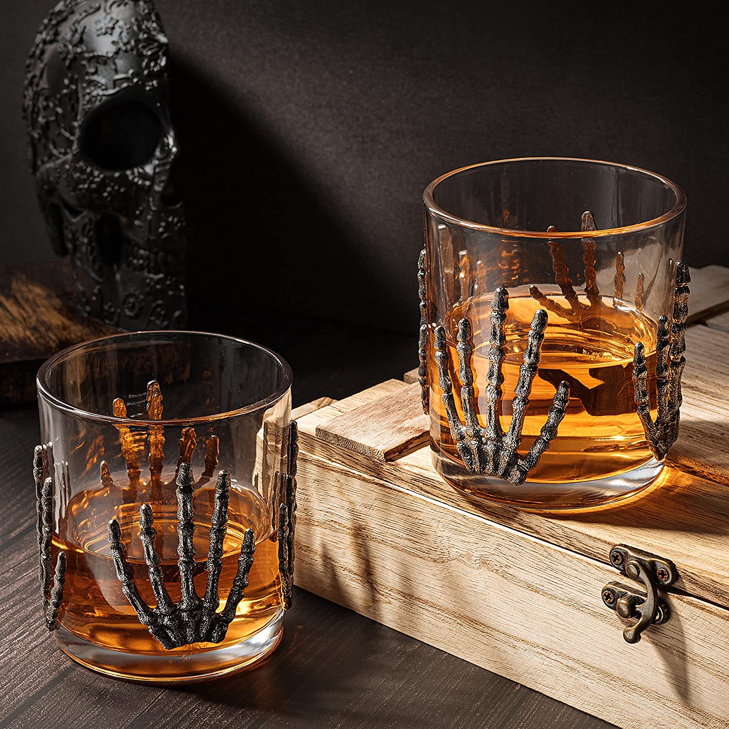 - It's a ghoulish good time always with our Skeleton Hand Whiskey tumblers! A must have for Halloween or any time of the year you want to celebrate the macabre. Be a little more frightening at your next dinner party! This spooky wine glass set is a great gift for any wine lover! Perfect for Halloween and beyond, the design of this two-piece set recalls a vintage ossuary. Scare the heck out of your guests while they enjoy their favorite spirit.