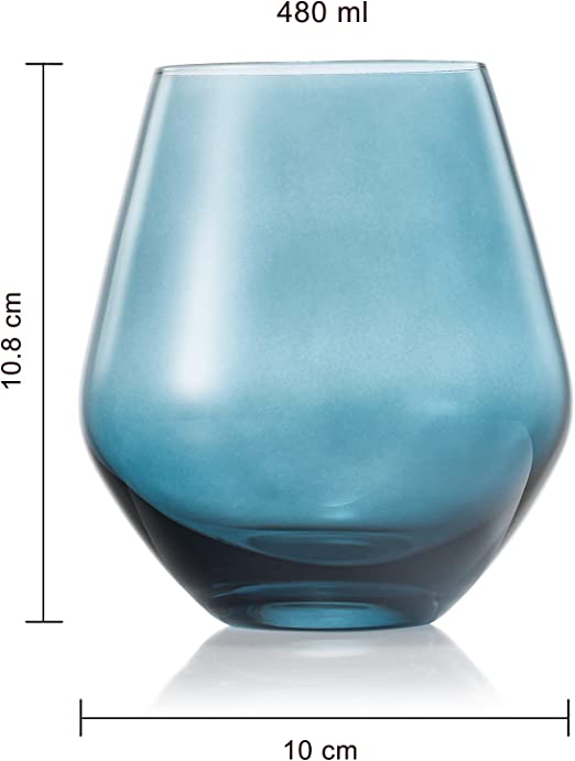 - This set of 4 stemless glasses features an assorted set of colors perfect for entertaining! Pure luxury accentuated in every detail from the color saturated top rim to the bottom of each glass. This set features a tall, sleek silhouette that makes an impression from across the room. Every glass in this set is unique, yet equally beautiful. The hand-blown style and vibrant colors of our luxury wine glasses are sure to be a conversation piece around your table.