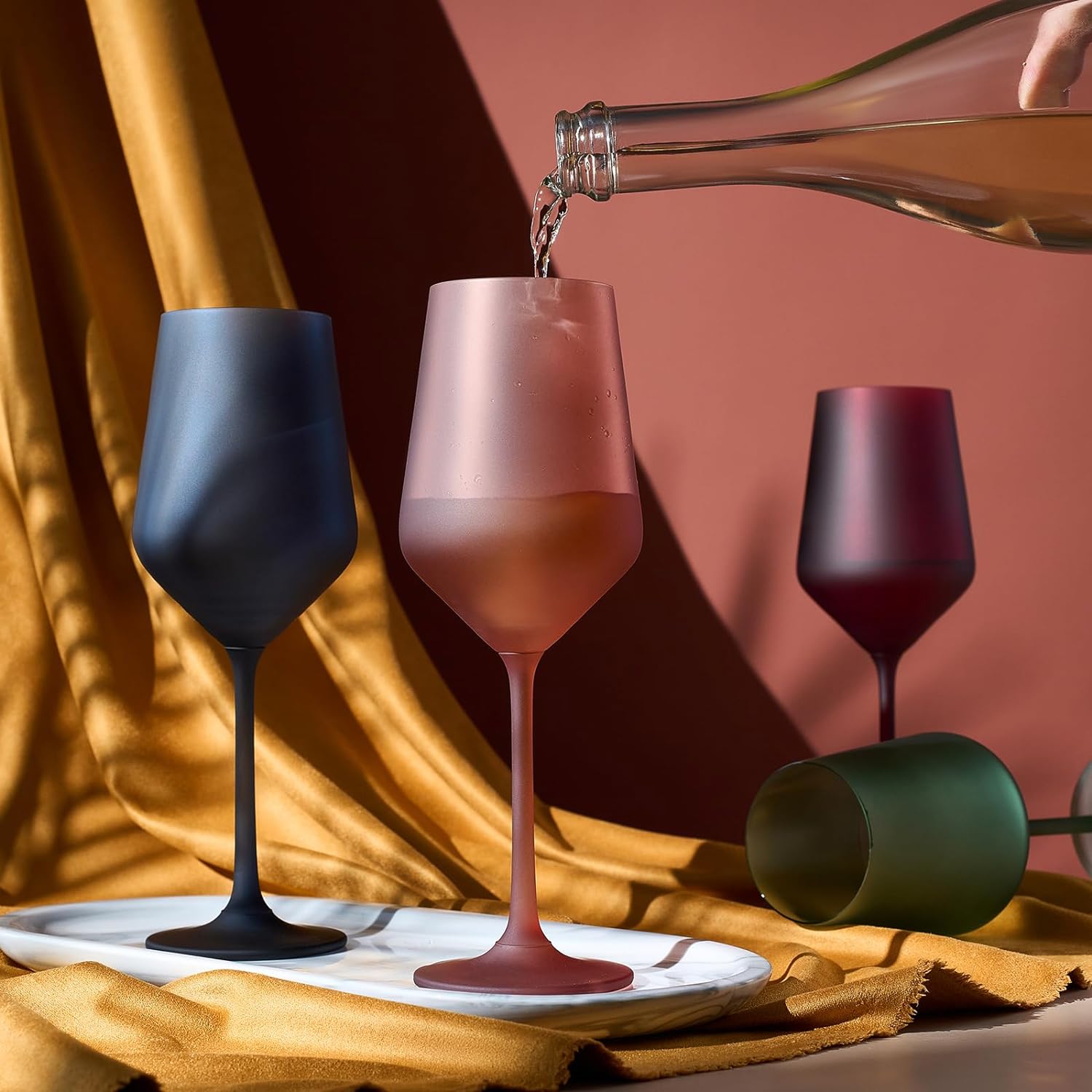 - This exquisite set of wine glasses comes in a muted color palette that includes frosted red, burnt orange, green, and cloudy blue. These muted tones exude a sense of calm and refinement, making them versatile for various occasions and decor styles. Whether you're hosting a cozy dinner party or unwinding after a long day, these glasses add a touch of sophistication to any setting.
