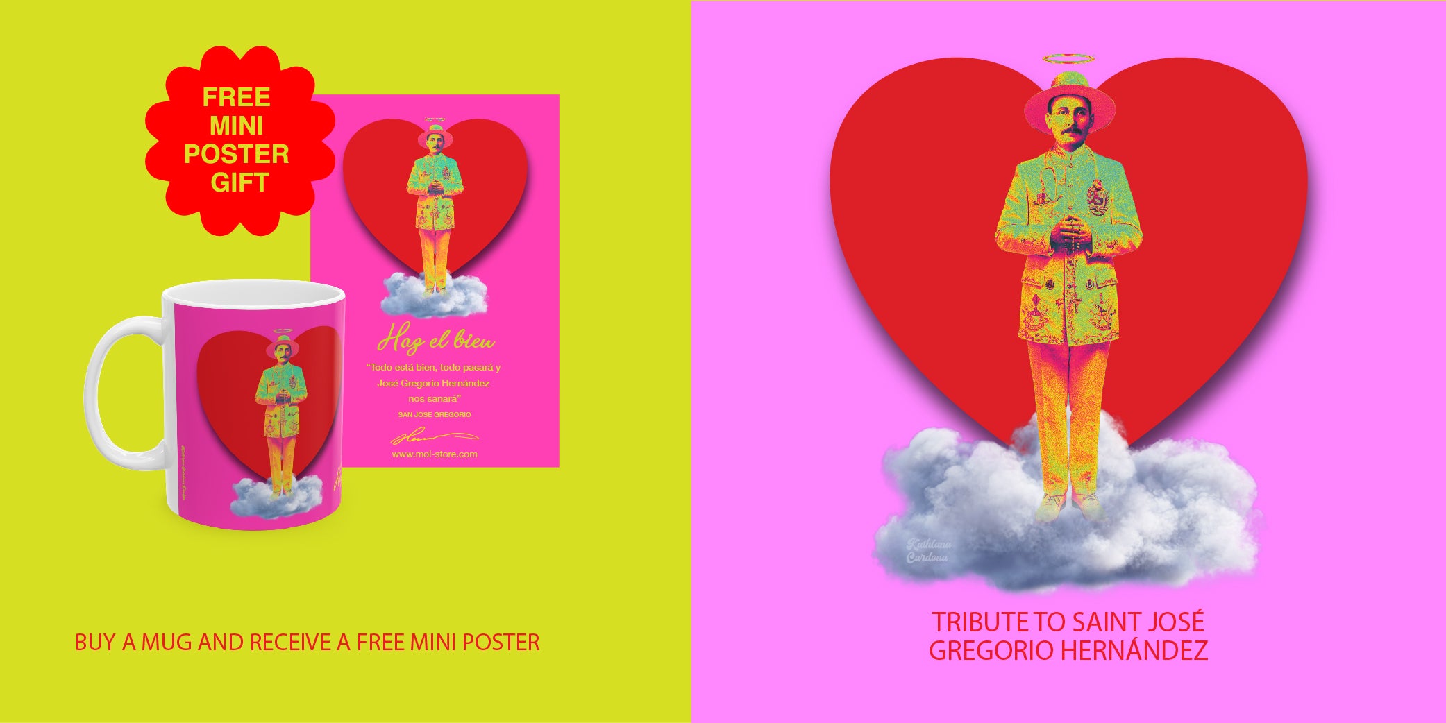 Discover products inspired by Saint José Gregorio Hernández. Each piece carries a fragment of his healing spirit. Take home a mug and receive a free mini poster with his image and an inspiring message.